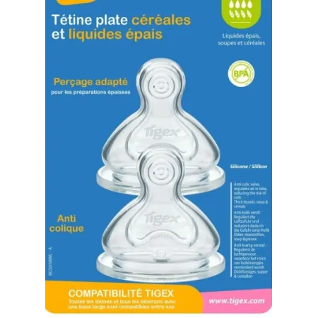 Las 2 Tetinas Transition para cereales de silicona de Tigex son la elección ideal para bebés de más de 6 meses que ya requieren un flujo rápido y una experiencia más adaptada a su ritmo. Su diseño ergonómico de cuello ancho favorece una transición natural del pecho al biberón, simulando al máximo la forma del pezón materno.