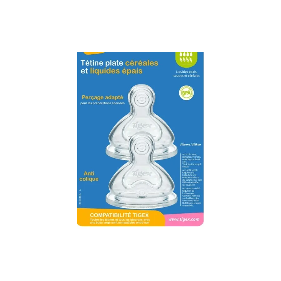 Fabricadas en silicona de grado médico, estas tetinas son libres de BPA, anticólicos y perfectamente adaptadas a los biberones Tigex de cuello ancho, lo que garantiza compatibilidad total y facilidad de uso. Además, vienen en formato ahorro de 2 unidades, ideal para tener siempre una de repuesto.