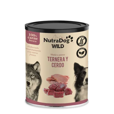 Alimento húmedo 100 % natural de ternera y cerdo para perros NutraDog WILD Gourmet. 800g
