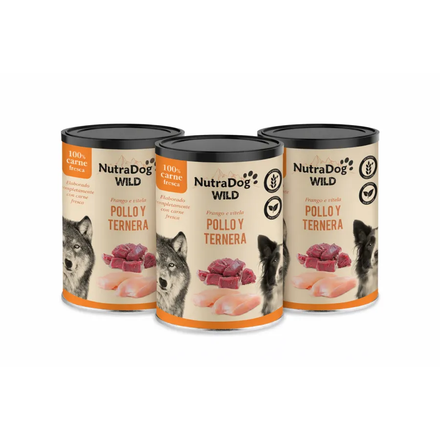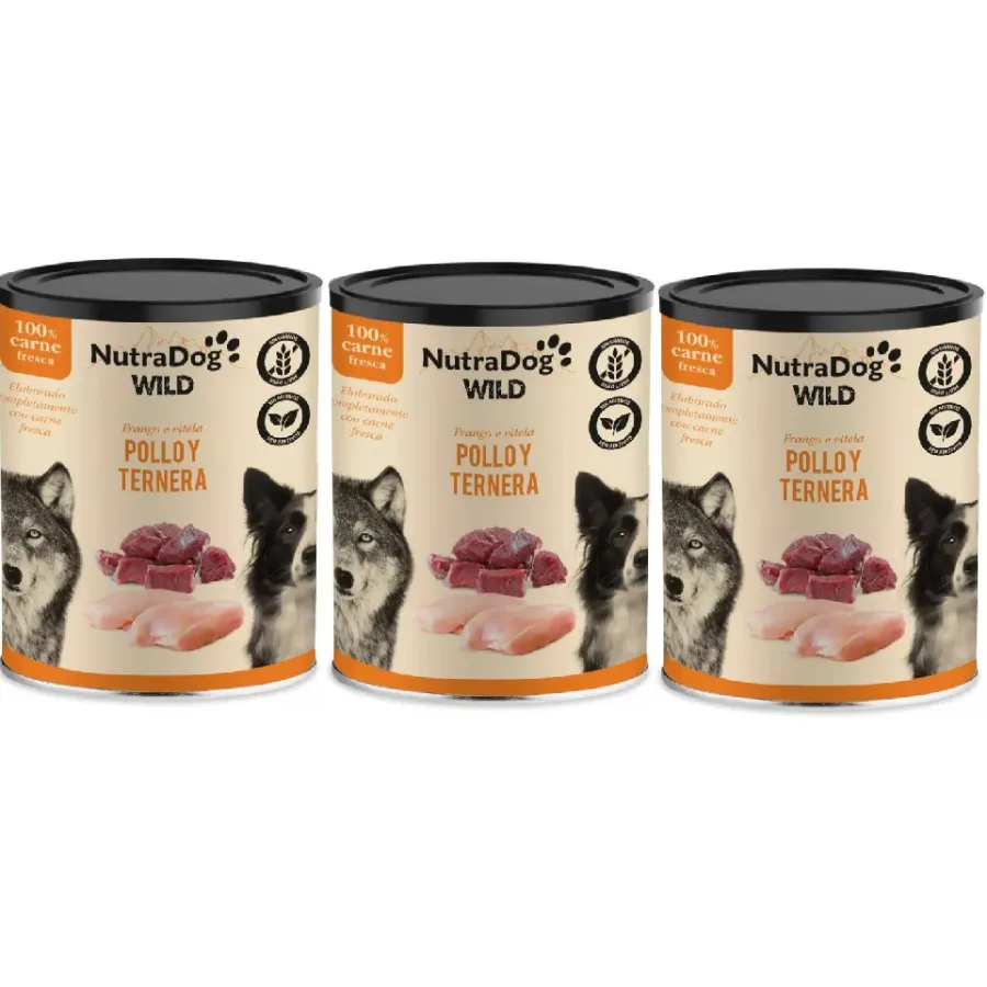 Alimento húmedo 100 % natural de pollo y ternera para perros NutraDog WILD. Pack Ahorro 3 x 800g