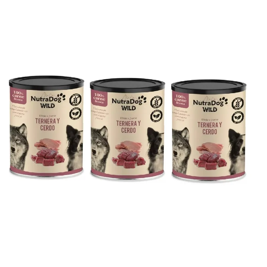 Alimento húmedo 100 % natural de ternera y cerdo para perros NutraDog WILD. Pack Ahorro 3 x 800gr