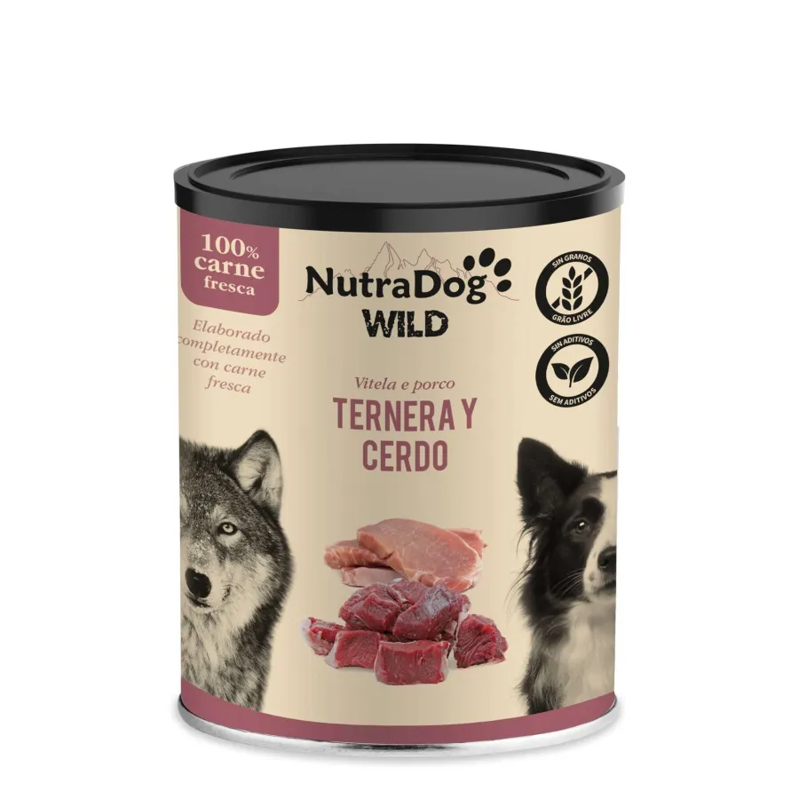 Alimento húmedo de NutraDog WILD para perros 100% natural, elaborado únicamente con ternera y cerdo. Los perros son animales carnívoros y necesitan una dieta rica en carne y grasas de calidad para satisfacer sus necesidades proteicas. Este alimento es una mezcla ideal de ternera y cerdo, sin aditivos ni ningún otro ingrediente.
