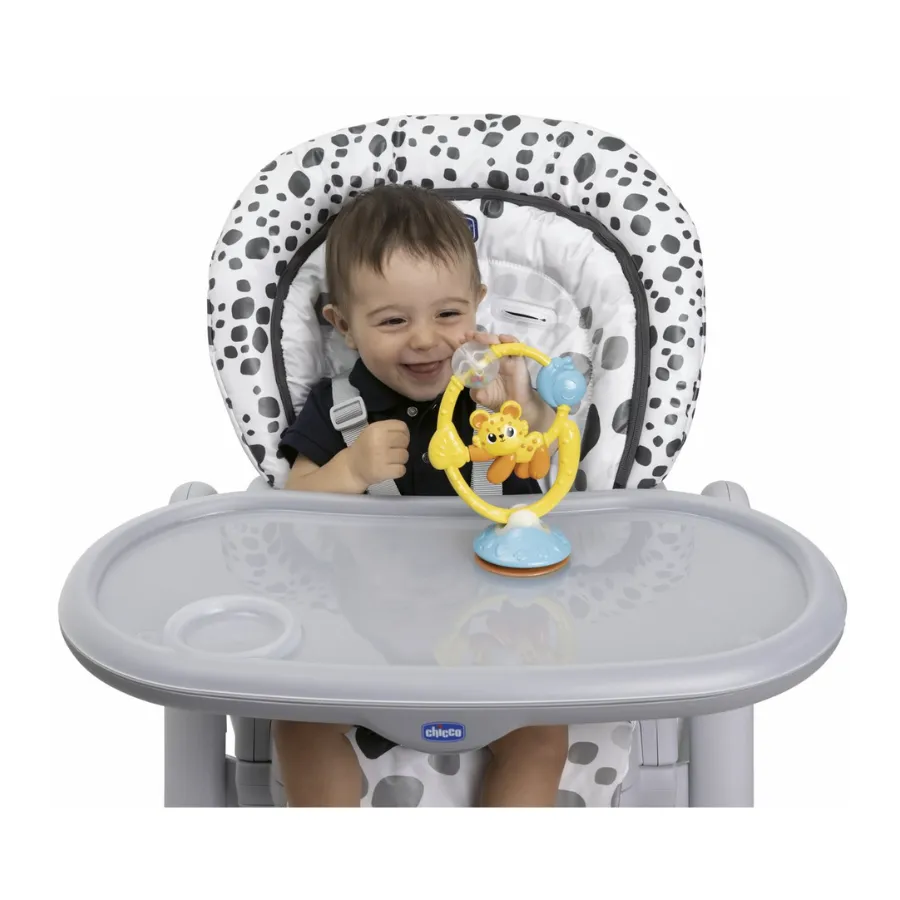 Gracias a su ventosa antideslizante, este juguete se fija de forma segura en la trona, mesa o silla alta, permitiendo que tu bebé juegue con total libertad sin que el juguete se desplace o caiga.