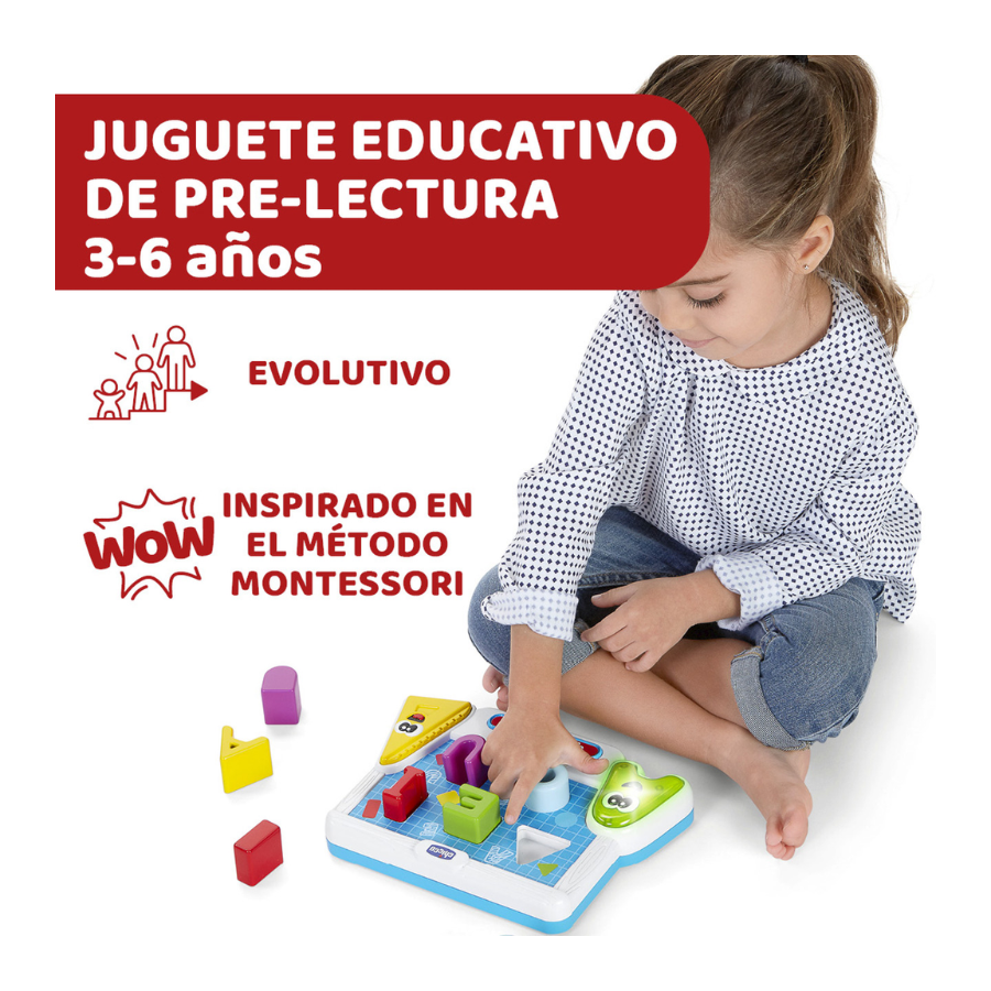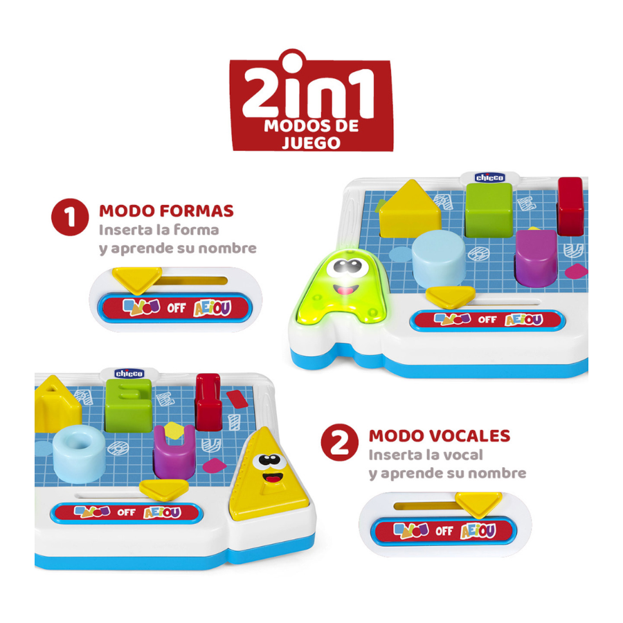 “Aprendo las vocales. Chicco” es un juguete educativo electrónico especialmente diseñado para ayudar a los más pequeños a reconocer y memorizar las vocales de forma natural, mediante sonidos, luces y colores que estimulan los sentidos.