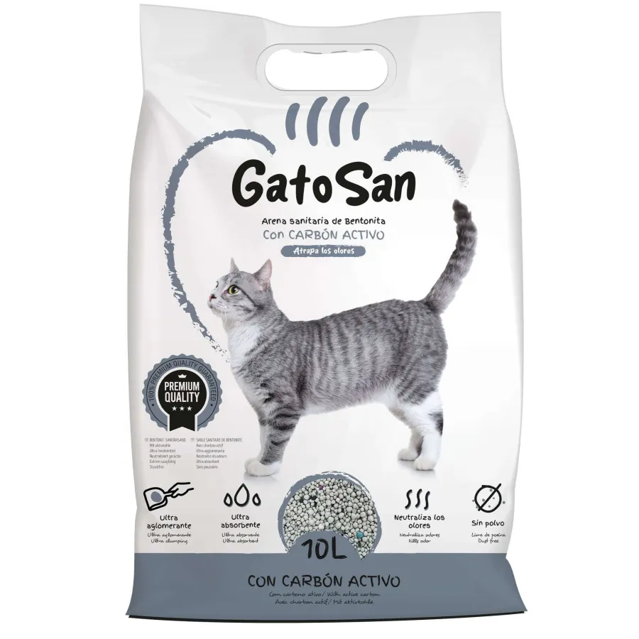 "GatoSan: Arena sanitaria de bentonita con carbón activado en presentación de 10 litros, perfecta para ofrecer a tu gato un entorno limpio y cómodo, gracias a su capacidad para aglomerar los desechos y controlar los olores de manera efectiva, asegurando así una experiencia higiénica y agradable tanto para tu mascota como para ti."