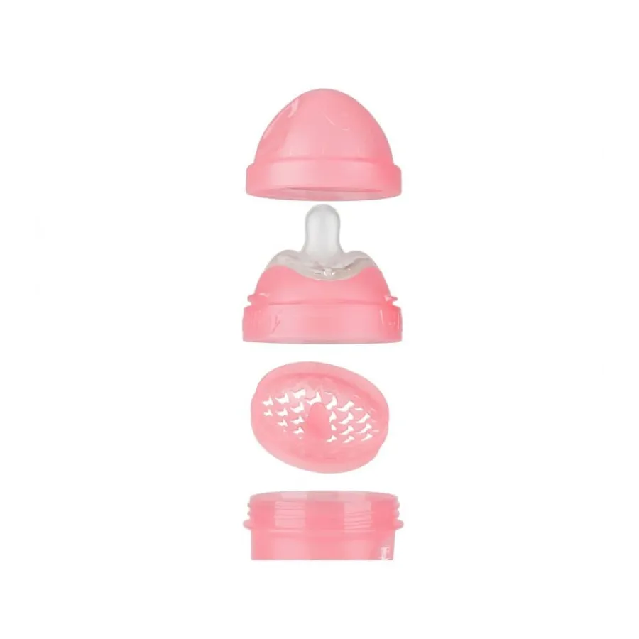 Con doble sistema anticólico pensado para reducir al máximo las molestias del bebé evitando la entrada de gases en las tomas. La tetina de silicona está diseñada imitando el pecho de mamá evitando el rechazo y facilitando la adaptación al biberón.