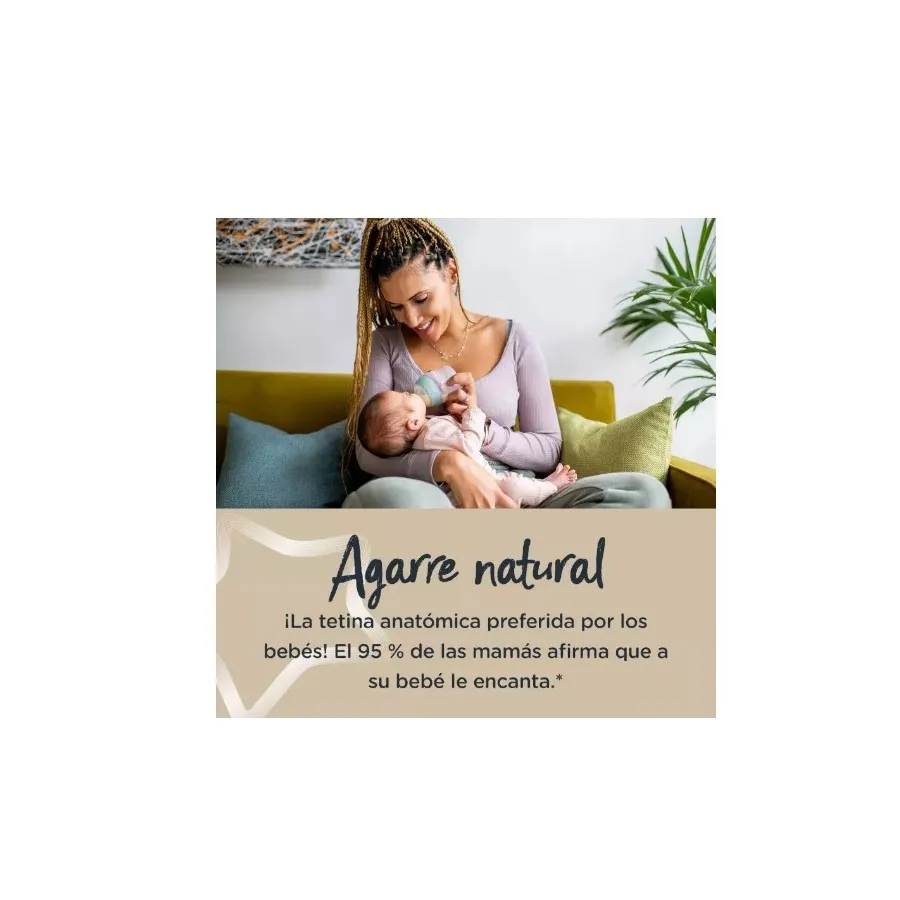 Tetina de silicona blanda: La tetina de silicona blanda asemeja la piel de mamá, que se estira y flexiona durante la toma para imitar la acción natural de amamantar.