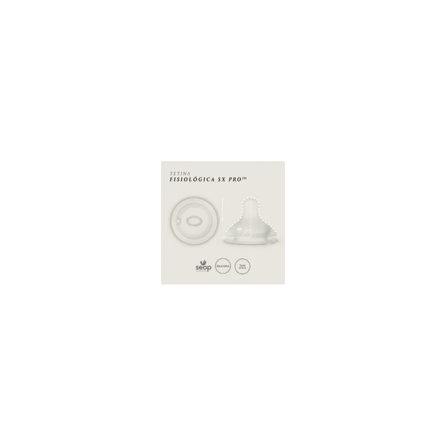 Cuenta con una boca ancha que facilita el llenado y la limpieza y una tetina fisiológica anticólico SX Pro de flujo lento que se adapta a la boquita del bebé como el pecho materno. Esta innovadora tetina reduce eficazmente la presión sobre la cavidad oral del bebé permitiendo una succión natural. Está elaborada minuciosamente con silicona fina, muy flexible, suave y cálida, de textura arenada imitando fielmente el pecho materno. El flujo lento permite que el bebé reciba exactamente la cantidad de líquido que necesita, igual que con la lactancia natural.