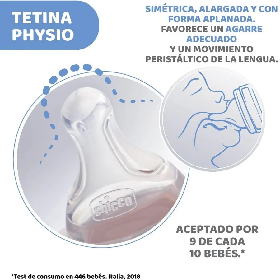 - Flujo rápido: ideal para alimentación cotidiana del bebé. La tetina Physio de Chicco está disponible en 4 flujos diferentes que se adaptan a las etapas de desarrollo (lento, medio, rápido y papilla).