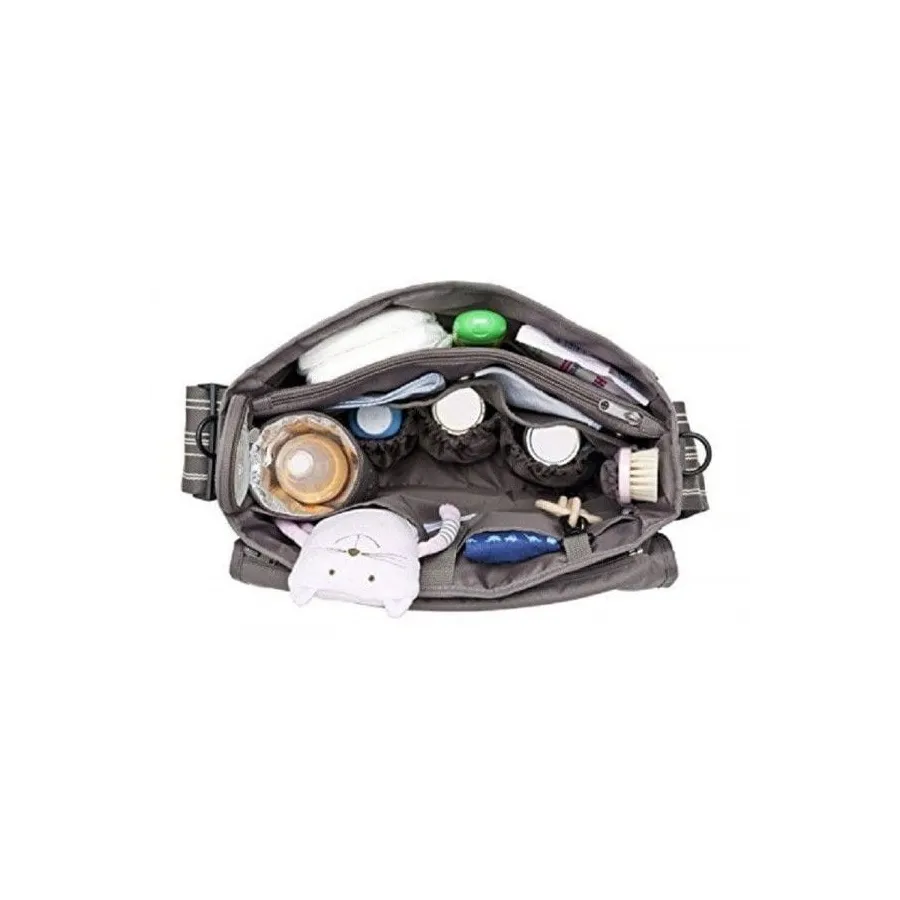 En esta bolsa podrás llevar todo lo que necesita tú bebé. Es diseñado pensando en todas las necesidades de los padres: Posee un buen tamaño con muchos compartimentos que te permitirá organizar todo mucho mejor. Además de compartimentos, tiene accesorios de quita y pon como un cambiador, una bolsa térmica para termos o biberones y una carterita, todos estos accesorios tienen enganches para que no se te pierdan o los puedas colocar tanto dentro como fuera de la bolsa. Puedes llevar el bolso colgado de la cinta o sujetarlo a la silla de paseo con los dos enganches laterales. Además la solapa es intercambiable por lo tanto puedes cambiarla a tu gusto.