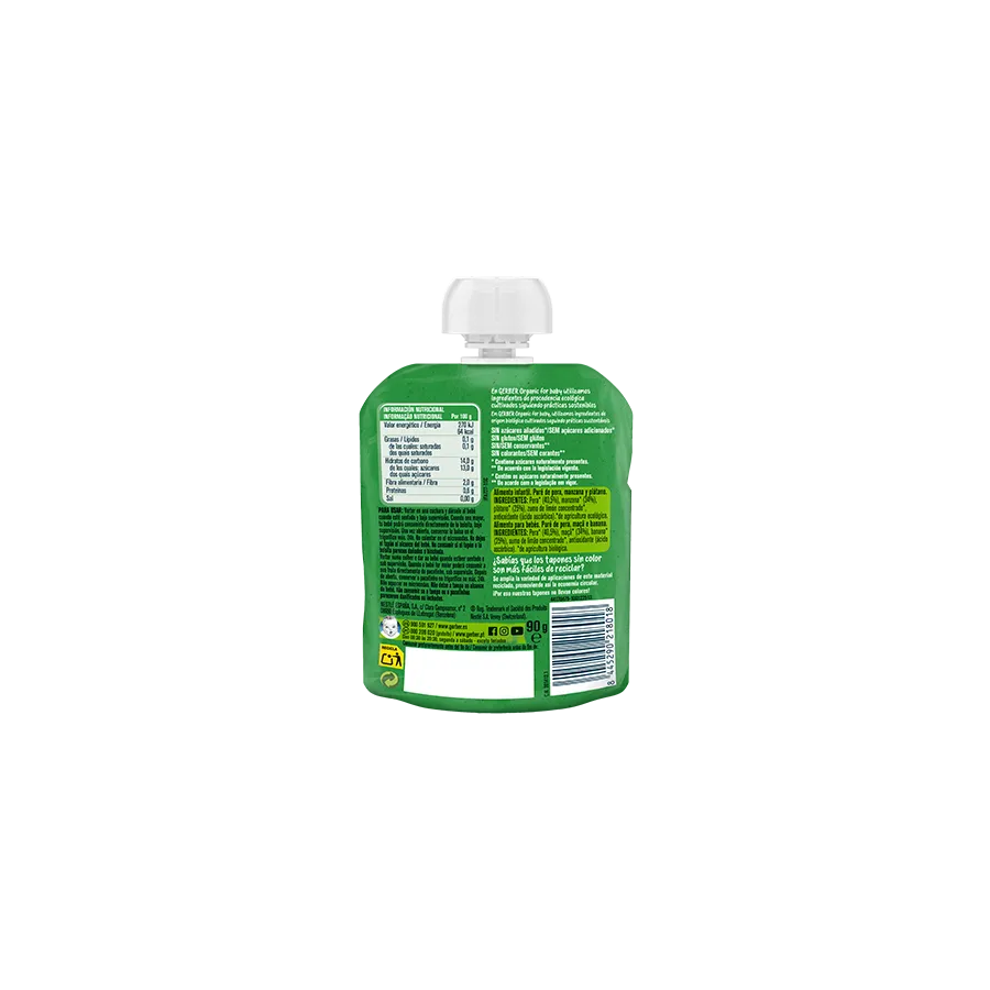 -Puré de frutas para bebés sin conservantes ni colorantes. Según la legislación vigente.