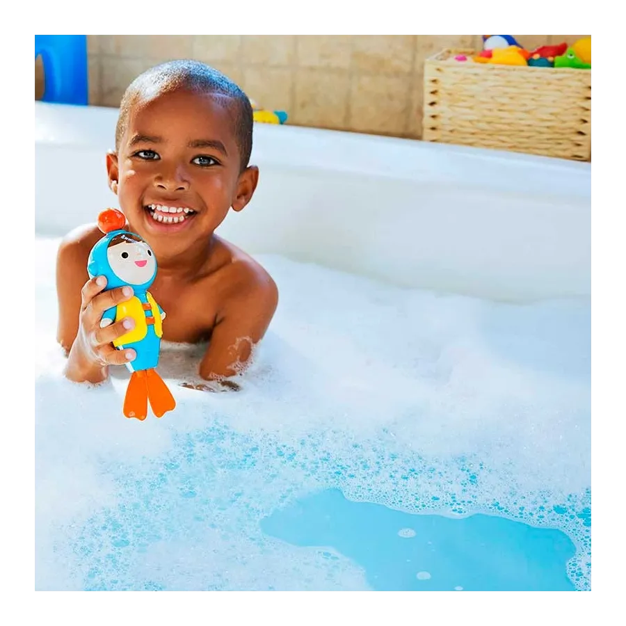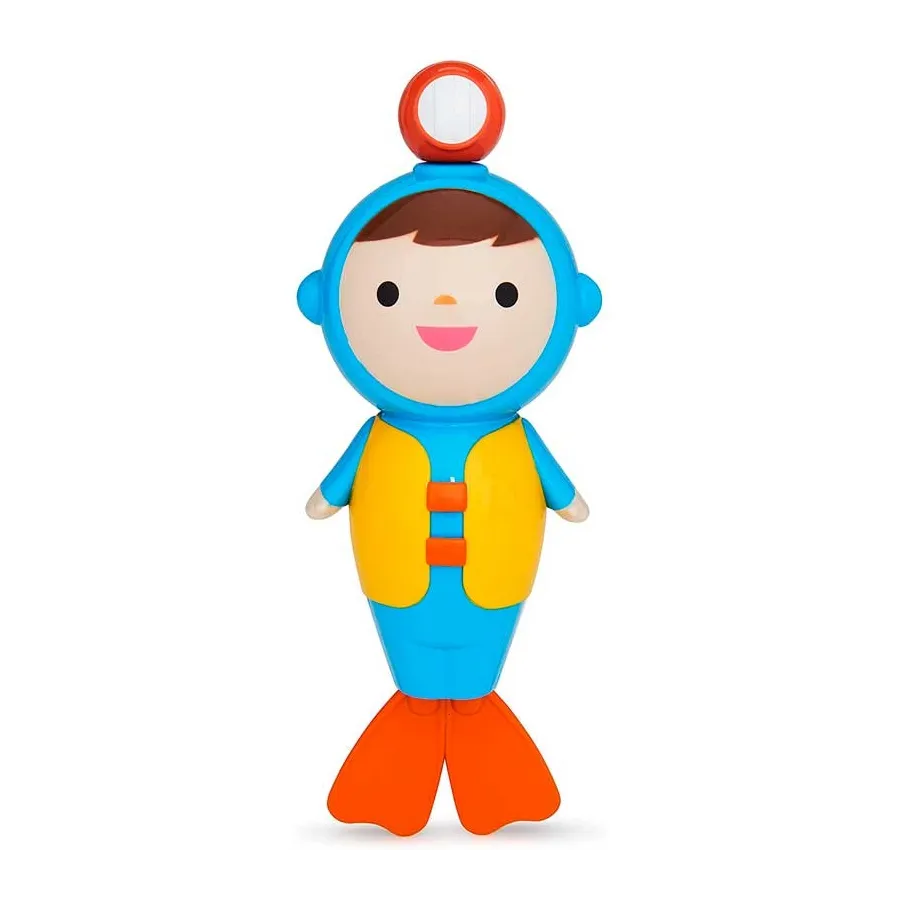 Con éste divertido Buzo chapoteador de Munchkin , será todo un éxito a la hora del baño de tu bebé , porque éste simpático buzo sabe nadar , solo con tirar del faro y colocarlo en el agua , se desplazará por toda la bañera moviendo la cola