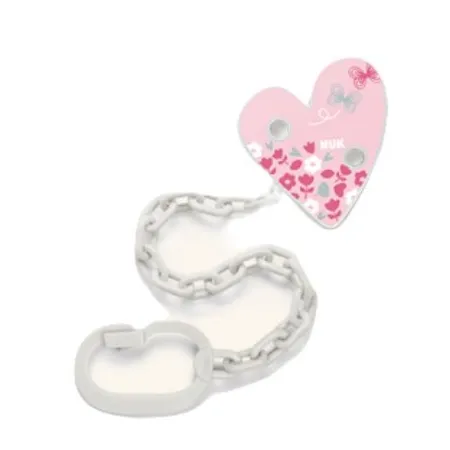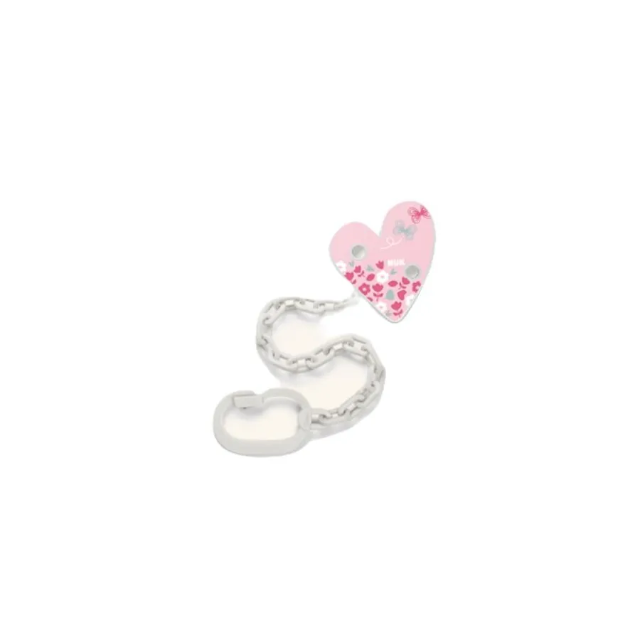 Cadenita Nuk sujetachupetes de Nuk . La cadena posee una pinza para sujetar los chupetes con anilla evitando que se caigan al suelo y se manchen o se extravíen. La pinza es muy práctica, segura y de fácil sujeción a la ropita de tu peque.