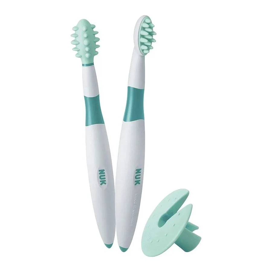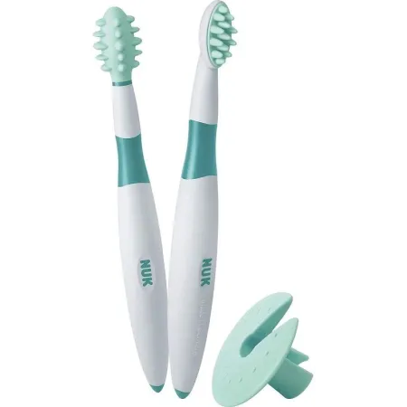 Este increíble Set de 2 Cepillos dentales de entrenamiento de NUK ha sido diseñado pensando en cómo facilitar el proceso de introducción de la higiene bucal de los bebés con más de 6 meses que sienten molestias asociadas a la dentición.