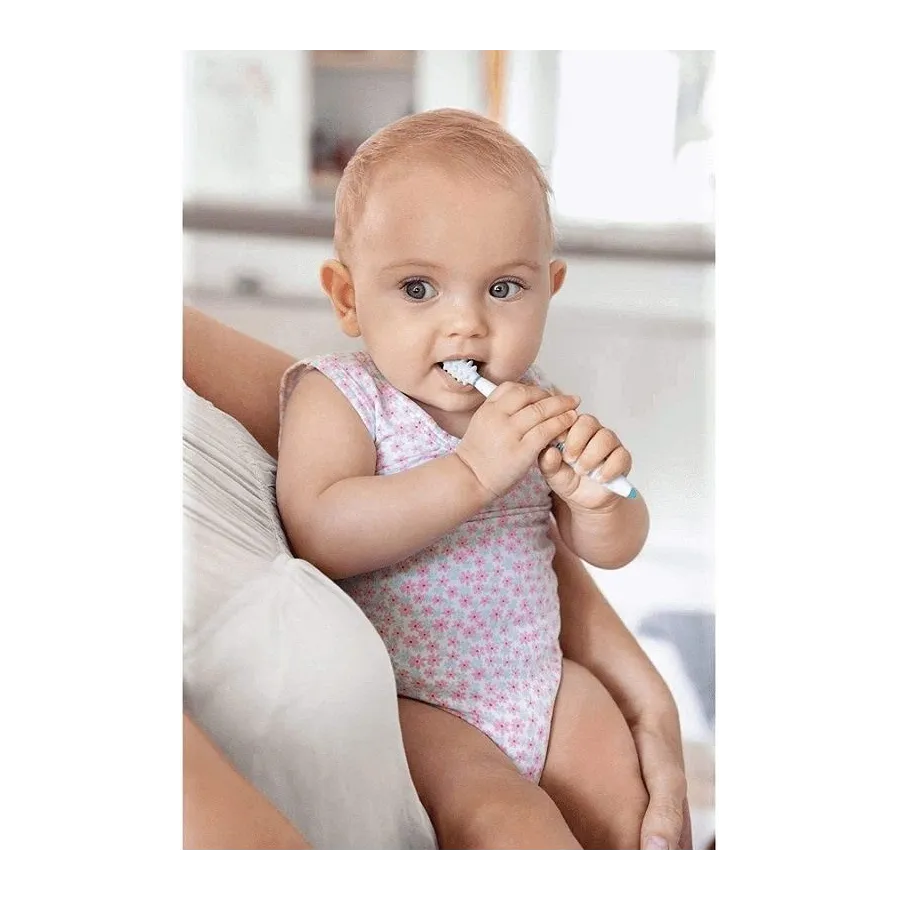 El juego contiene un cepillo dental super suave, hecho especialmente para la delicada boquita de los bebés, y también un mordedor que masajea y ayuda con las molestias causadas por la presión de las encías.
