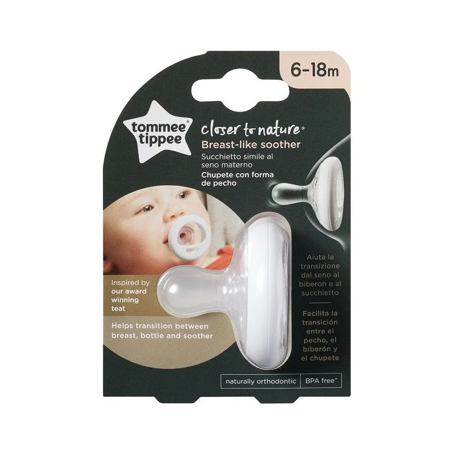 Este novedoso chupete de Tommee Tippee que simula la forma de tu pecho, por lo tanto su posibilidad de rechazo es mínima, por lo tanto facilita la transición entre el pecho, el biberón y el chupete.