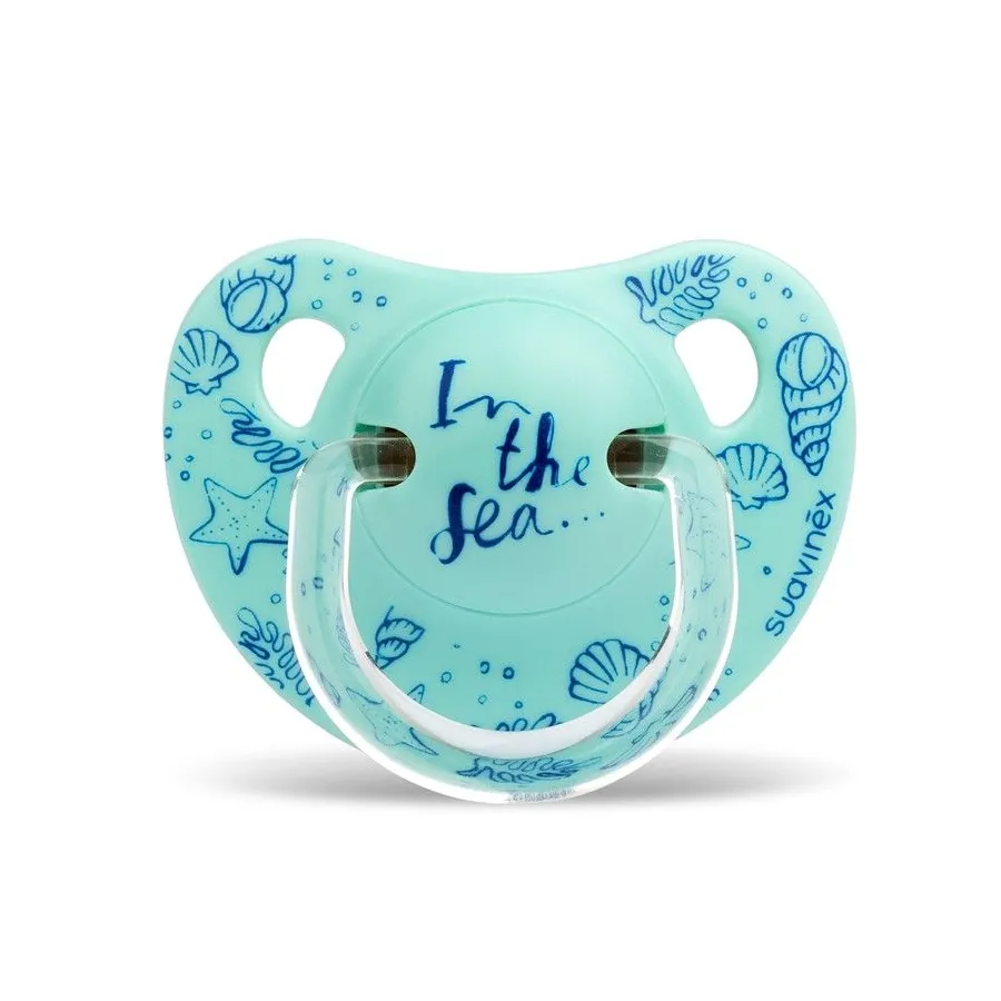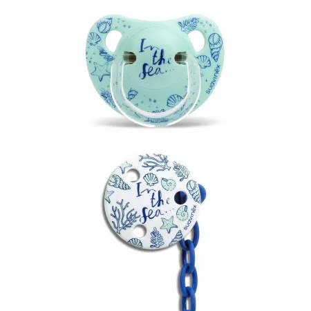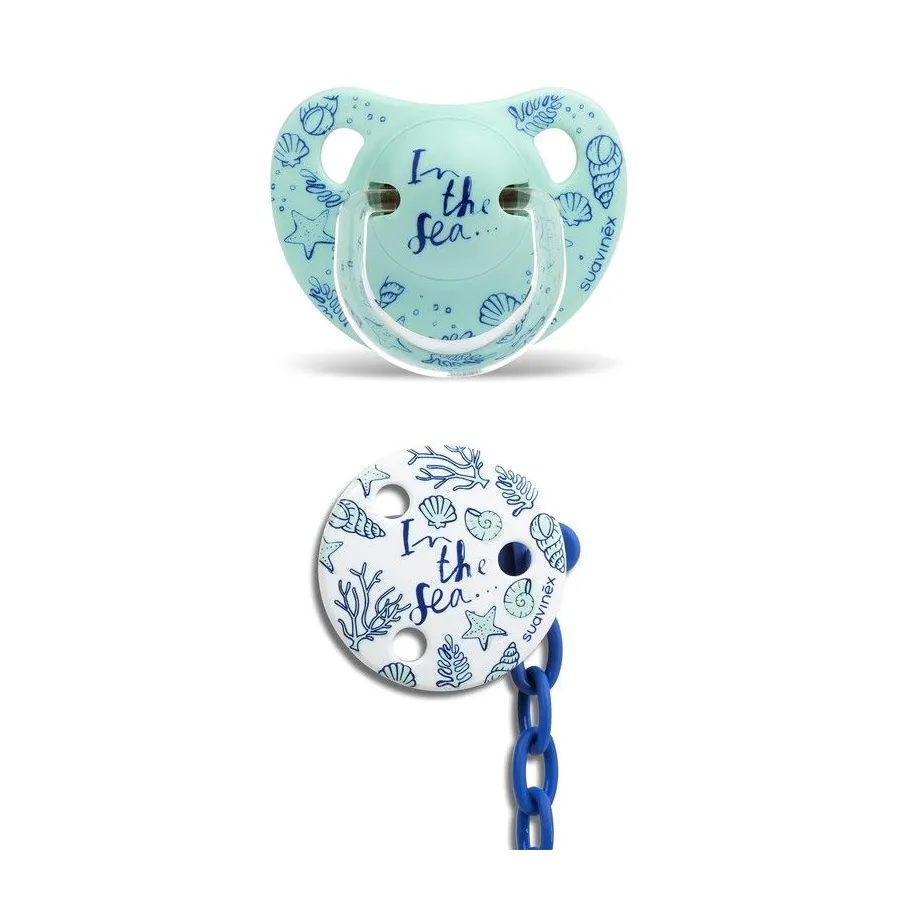 Pack de chupete y broche de Suavinex con dibujos de temática marina en tonos azules. Chupete con tetina anatómica de silicona para bebés de 6 a 18 meses.
