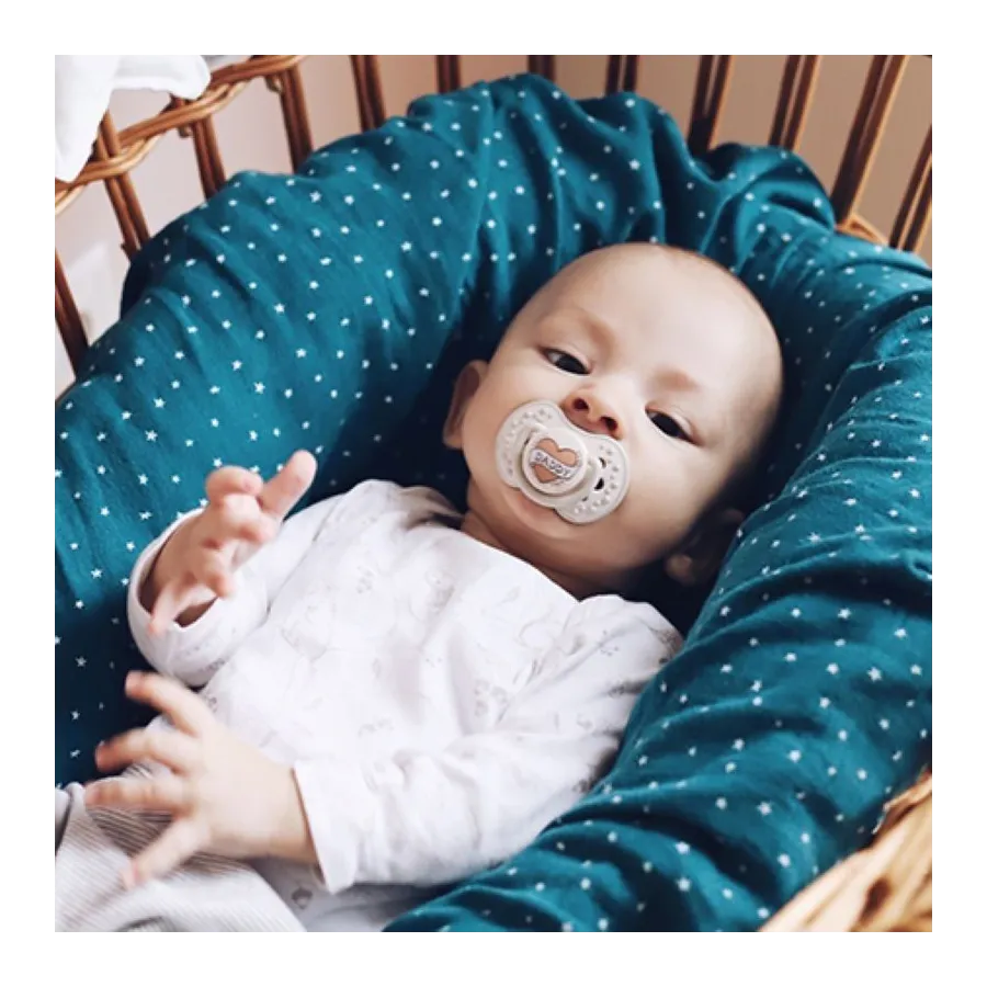 Ha llegado tu peque a casa y estás preparando todo para hacer del inicio de esta hermosa aventura un sinfín de hermosos momentos y vivencias únicas. Son muchos los temores y dudas, por ello te recomendamos todos los productos de LOVI que los crea pensando en el bienestar de los más pequeños y en tu tranquilidad. Como sabes un imprescindible son los chupetes, que son recomendados desde los primeros días de vida, pues pueden prevenir el Síndrome Muerte Súbita del Recién Nacido (SMSL). Este fantástico Chupete “ está indicado desde Recién Nacidos. La tetina es dinámica adaptándose al ritmo de succión que le imprime el peque y a su paladar, al ser más blandita tiene un excelente índice de aceptación por la mayoría de bebés. La anilla brilla en la oscuridad, Libre de BPA.