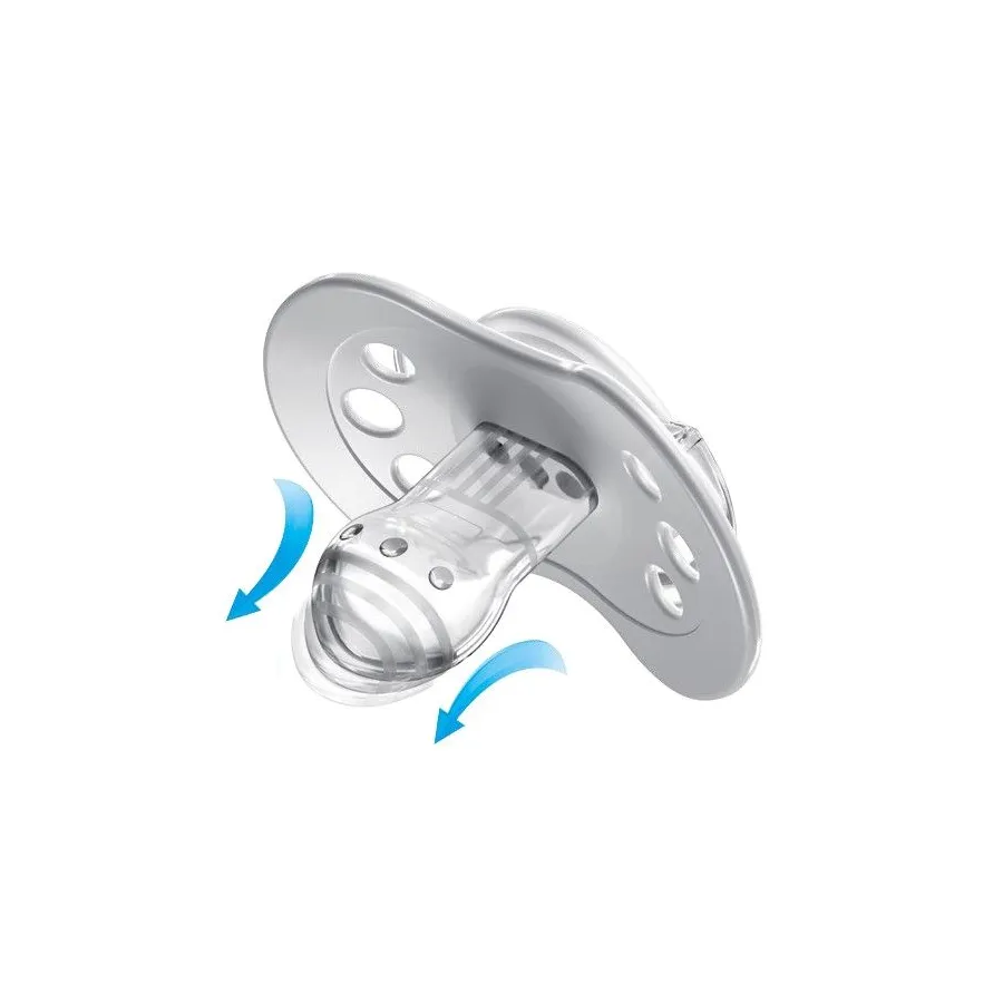*Permite mantener una succión saludable: Gracias al diseño de la tetina dinámica se garantiza que exista una respiración libre a través de su naricita y que a la vez pueda tragar saliva, lo que evita el reflejo de morder, permitiendo de esta manera, el correcto desarrollo del habla y del encaje de los maxilares.