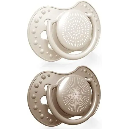 Presentados en una práctica caja esterilizadora, el pack de 2 chupetes dinámicos de Lovi Harmony son la mejor opción para consolar al bebé en los momentos críticos. Gracias al innovador diseño dinámico de la tetina de silicona el bebé ejercita la mandíbula de forma natural durante la succión. La tetina se contrae y se expande imitando el pecho materno. Este nuevo diseño respeta el desarrollo natural de la mandíbula, la dentición, la cavidad oral y el habla. Cuentan con un precioso escudo de diseño elegante, agujeros de ventilación y asa para colgar.