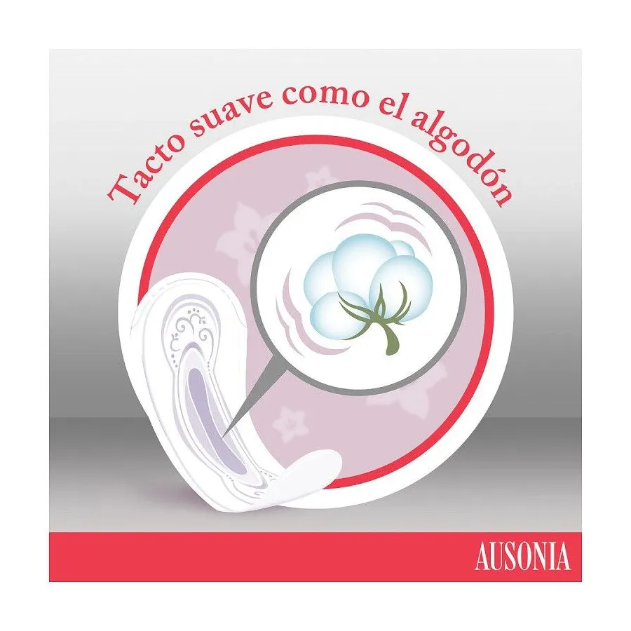 La compresa femenina Extraplana de Ausonia presenta una forma anatómica y un tejido suave y natural para el contacto con la piel.