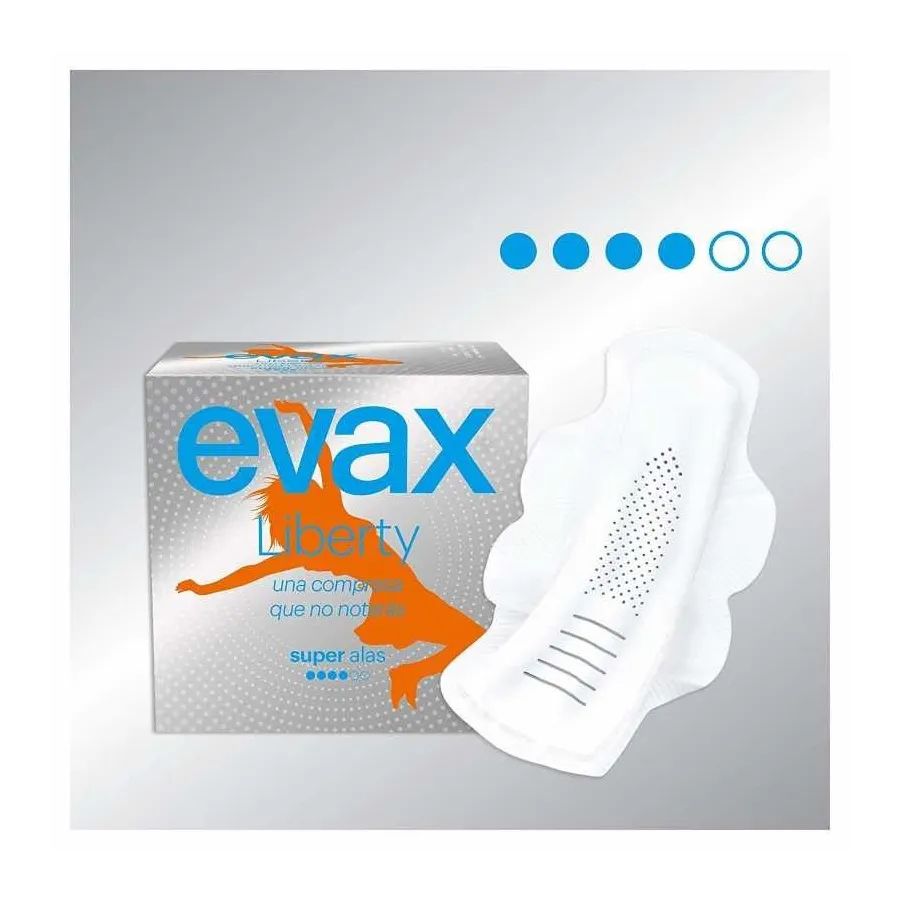 EVAX Liberty es la compresa más, más, más diferente de todas. EVAX Liberty está fabricada íntegramente con Flexicel, un material exclusivo que se adapta perfectamente a tu cuerpo para que no la notes ni la sientes, y elimina la humedad de la piel para mantener la sensación de comodidad y limpieza durante todo el día. Además, tienen una delicada fragancia que neutraliza el olor y garantiza el frescor. Da un paso más en tu higiene íntima gracias a las compresas EVAX Liberty que son 40% más absorbente que las EVAX Cottonlike