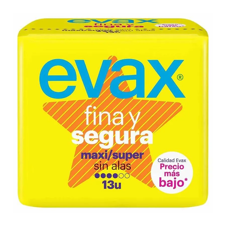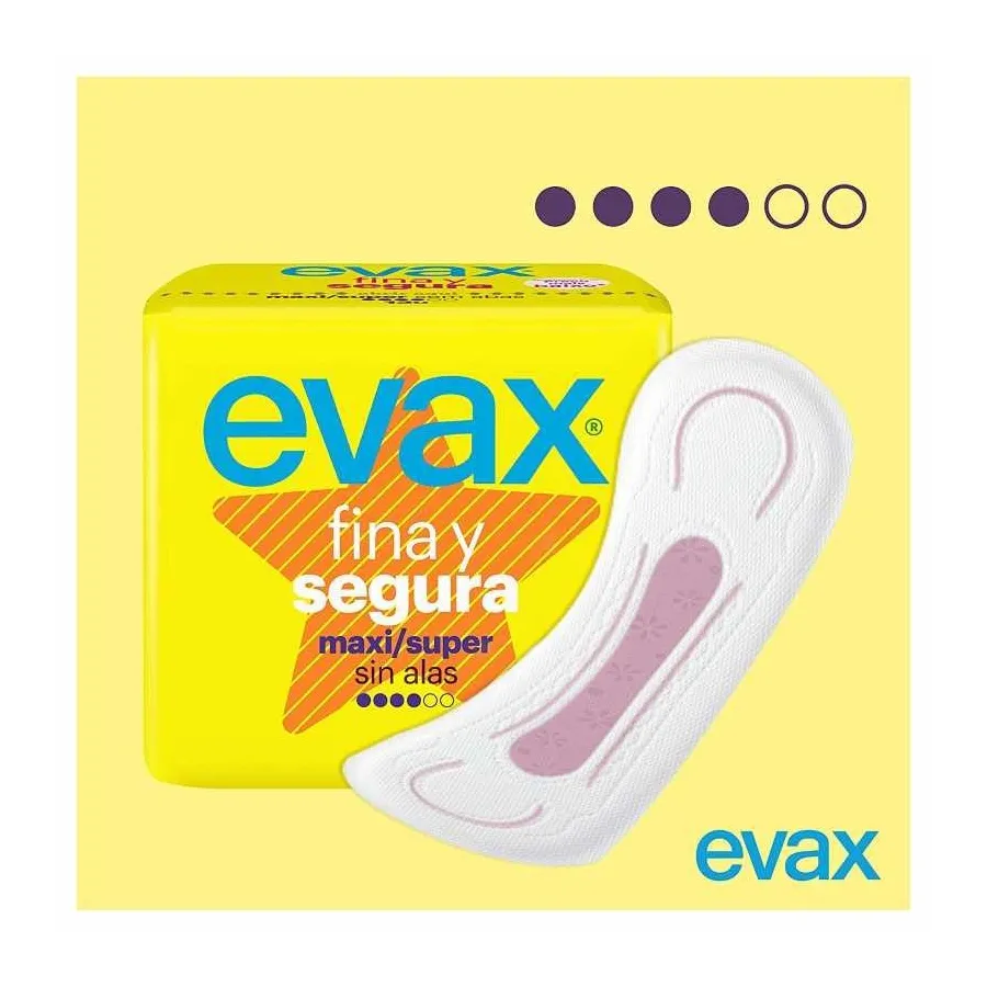 Las compresas EVAX Fina y Segura Maxi Sin Alas son finas para ofrecerte una mayor comodidad, incorporan el Sistema No Olor, su núcleo superabsorbente te permitirá sentirte segura y protegida durante todo el día. Son perfectas para los primeros días del periodo.