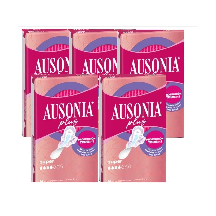 Compresas Super Ausonia Plus con alas, Pack Ahorro 5 x 14
