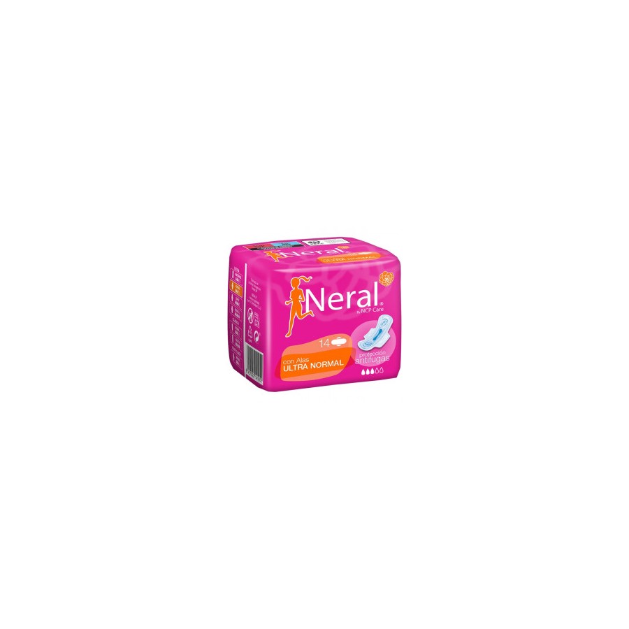Las compresas ultra normal con alas de Neral han sido diseñadas para brindarte protección y comodidad durante el día. Cuentan con alas para una mayor sujeción a la ropa interior y un ajuste perfecto que se adapta al cuerpo. Gracias a la capa superior que absorbe al instante te sentirás seca y segura durante los días de flujo normal. Estas compresas incorporan pequeños canales para proteger dónde más se necesita y doble barrera anti fugas para tu tranquilidad. Formato paquete de 14 unidades.