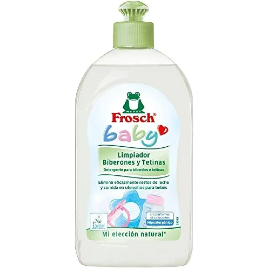 El limpiador de biberones y tetinas de Frosch ha sido pensado para lograr una limpieza efectiva y delicada de los biberones, tetinas, chupetes, juguetes y cualquier utensilio lavable del bebé. Gracias a su fórmula con principios activos naturales y tensioactivos de origen vegetal, es producto fácilmente biodegradable y de producción sostenible que elimina todos los residuos de los objetos del bebé favoreciendo su durabilidad. No contiene perfumes, colorantes, microplásticos, ni ingredientes de origen animal. Frosch cuenta con 30 años de experiencia en la fabricación de productos de limpieza que respetan el medio ambiente. Hipoalergénico y dermatológicamente testado. PH neutro. Presentado en un bote de materiales reciclados y reciclables de 500ml con dosificador.