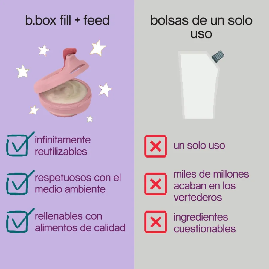 - Producto sostenible: reduce el uso de envases de un solo uso y es parte de la línea de alimentación ecológica de B.Box.