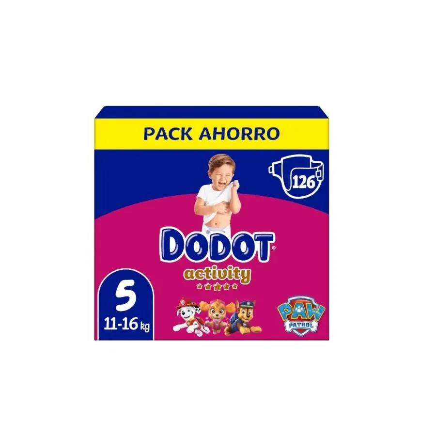 Pañales Dodot Activity Talla 5 (11 kg a 16 kg) estos pañales son perfectos para la etapa de crecimiento en que tu pequeñín comienza a moverse solo por la casa. Con Dodot Activity le brindarás la mayor comodidad y confort para que viva miles de aventuras sin que nada lo detenga. Gracias a sus canales de aire crean espacio para que el aire circule dentro del pañal proporcionando una piel seca y aireada. Proporciona una mayor absorción debido a su capa súper absorbente.