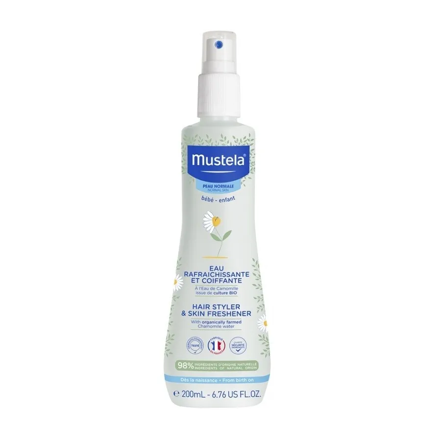 El agua para peinar refrescante de Mustela elaborada con un 98% de ingredientes naturales puede utilizarse en el pelo y el cuerpo en cualquier momento del día. Será tu mejor aliada para refrescar al bebé de forma agradable en momentos de calor intenso y desenredar el pelo