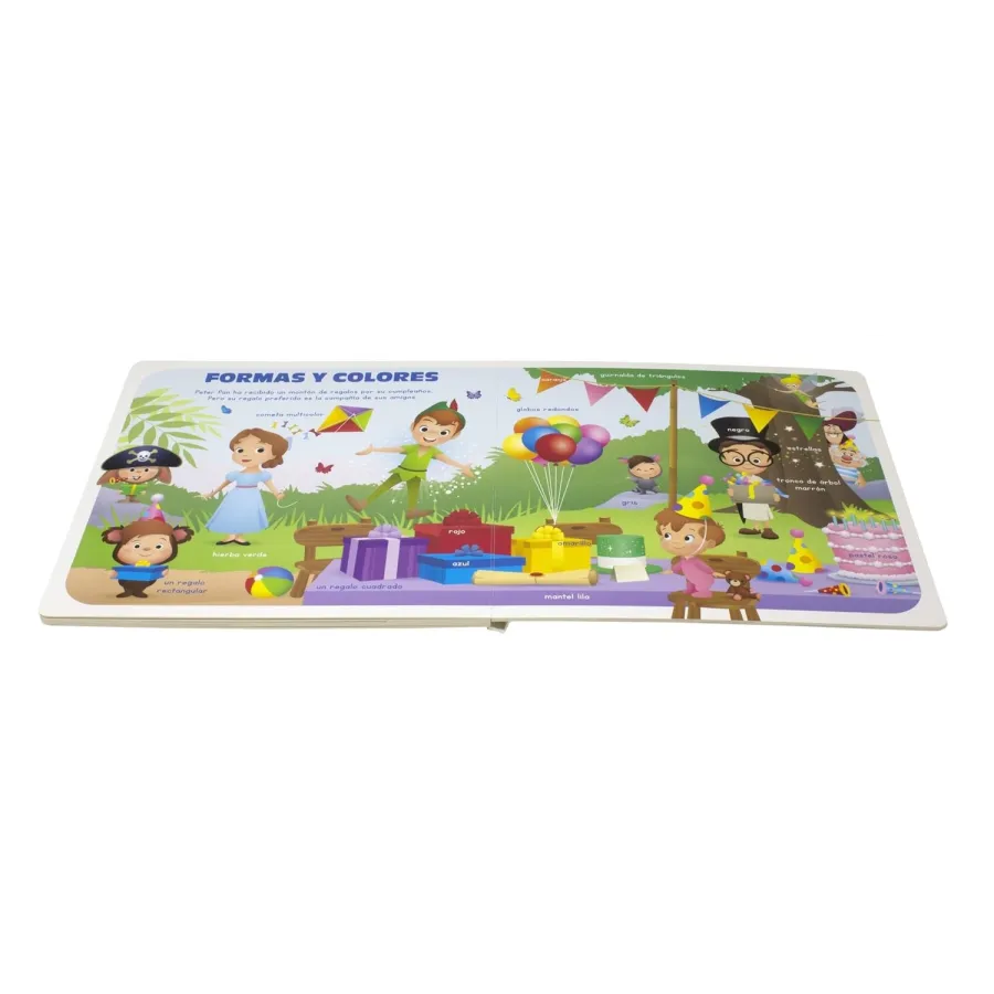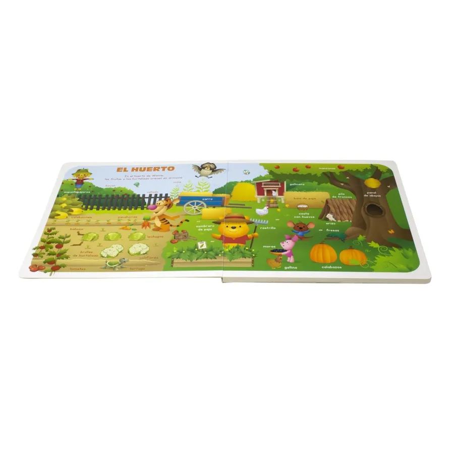 El gran libro de Disney cuenta con 16 páginas repletas de personajes Disney en diferentes entornos. De esta forma encontraremos rodeados de muchos colores y amiguitos a Winnie de Pooh en el huerto, a Bambi en bosque, al Simba en la Sabana… Todas las ilustraciones de personajes y objetos nuevos están acompañados de la palabra que los define, por eso es ideal para enriquecer el vocabulario básico y conocer el mundo que nos rodea de forma lúdica. ¡Es perfecto fomentar el gusto por la lectura de los más pequeños!