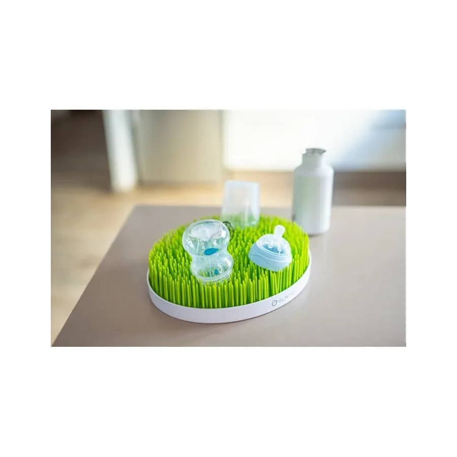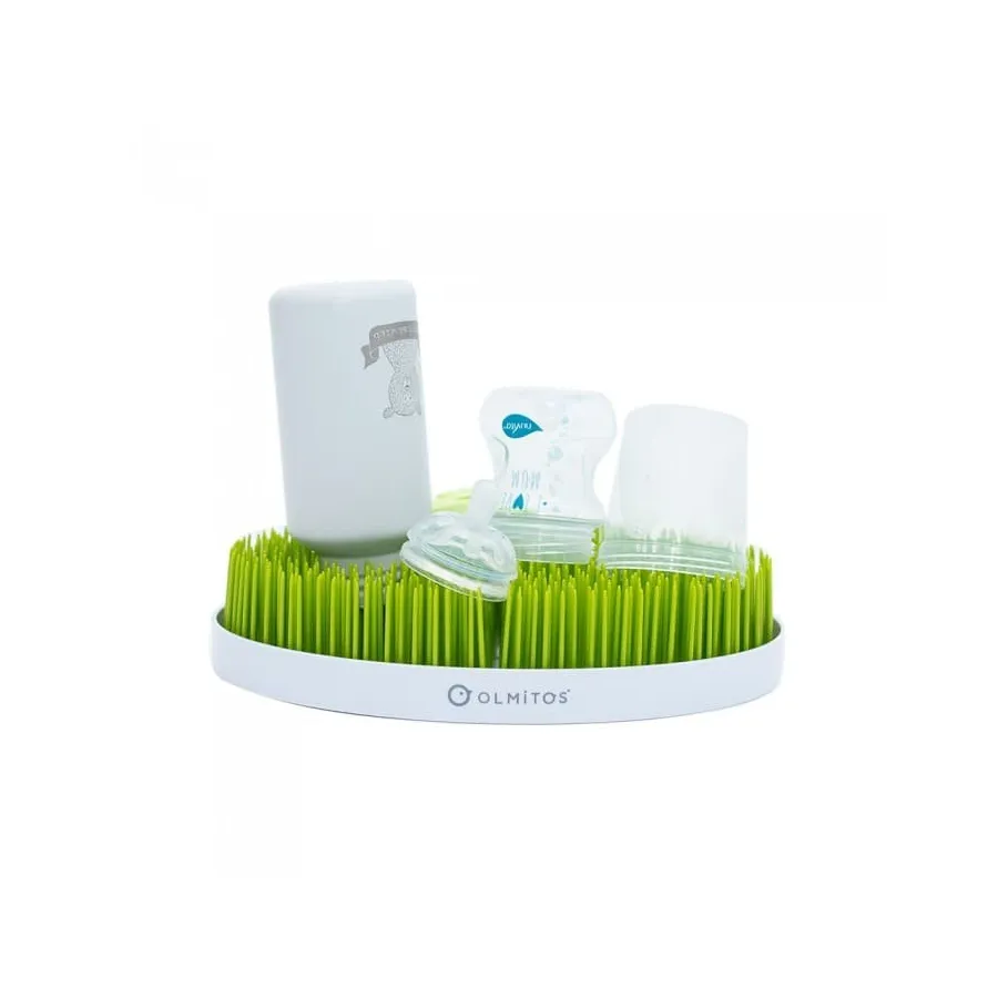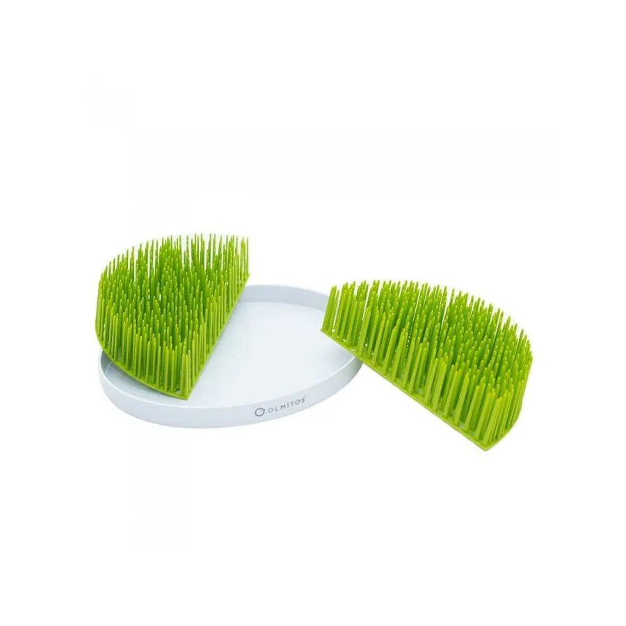 Útil y práctico escurridor de biberones cesped de Olmitos , con capacidad para biberones, tetinas, chupetes y tapones (todos sus accesorios).