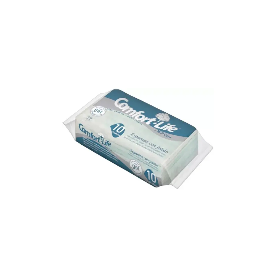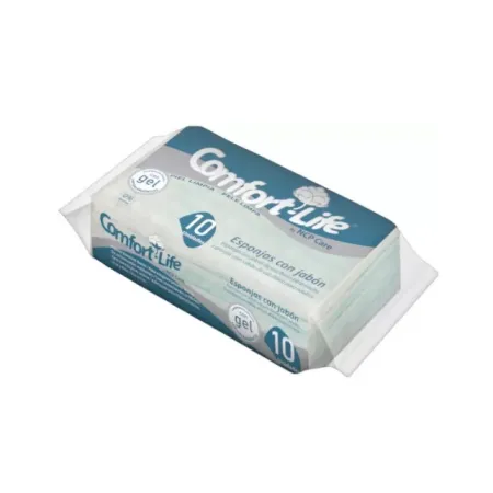 El paquete de esponjas con jabón Comfort Life incluye 10 unidades. Estas esponjas están impregnadas con jabón para facilitar la limpieza y el cuidado de tu piel.
