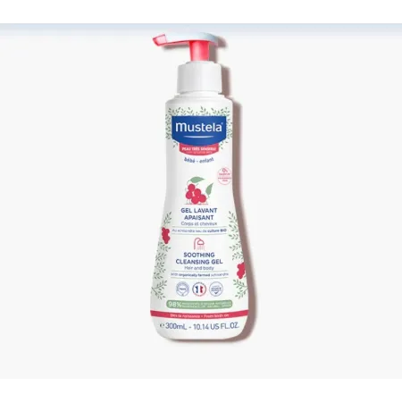 Gel de baño confort de Mustela. Deja la piel suave y el cabello sedoso con un olor agradable. Se aclara fácilmente.Limpia, protege y alivia con suavidad la piel frágil e inmadura del bebé.