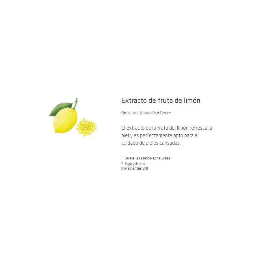 Composición:Agua, Alcohol, Citrus Limon (Lemon) Fruit Extract, Glicerina, Extracto de árnica (Arnica Montana Extract), Extracto de raíz de bardana (Arctium Lappa Root Extract), Agua destilada de hamamelis (Hamamelis Virginiana (Witch Hazel) Water), Extracto de raíz de iris (Iris Germanica) Root Extract, Extracto de endrina (Prunus Spinosa Fruit Extract), Extracto de corteza de endrino (Prunus Spinosa Wood Extract), Silicato de sodio (Hydrated Silica), Goma de xantano (emulgente y estabilizador natural), Sulfato de cobre, Citrato sódico, Aceites esenciales naturales, Limoneno, Linalool, Geraniol, Citral, perfume.