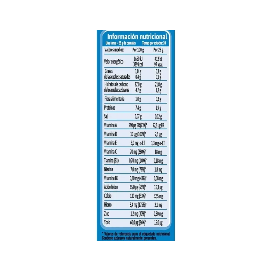 Cereales (97,2%) (harinas de arroz y arroz hidratada), aceites vegetales (girasol alto oleico, girasol) minerales (calcio, hierro, zinc y iodo) vitaminas (A, D, E, C, niacina, B1, B5 y ácido fólico), aroma (vanilla) y bifidobactrias (Bifidobacterium lactis).