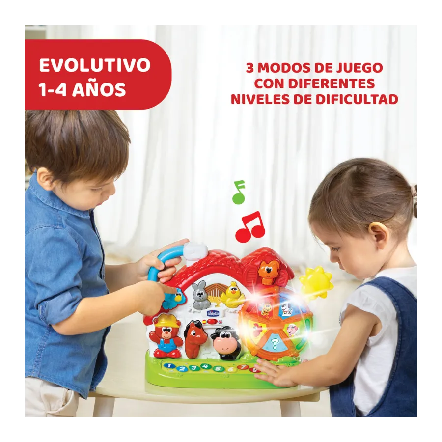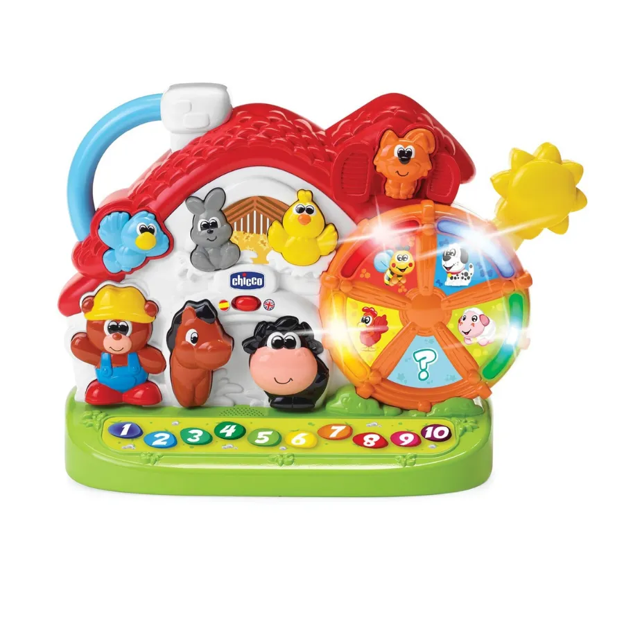 La Granja Bilingüe Chicco es un centro de actividades interactivo que combina diversión y educación en un mismo juguete. Con sonidos reales de animales, luces y frases en dos idiomas (español e inglés), este juguete fomenta el desarrollo sensorial, auditivo y del lenguaje desde una edad temprana.
