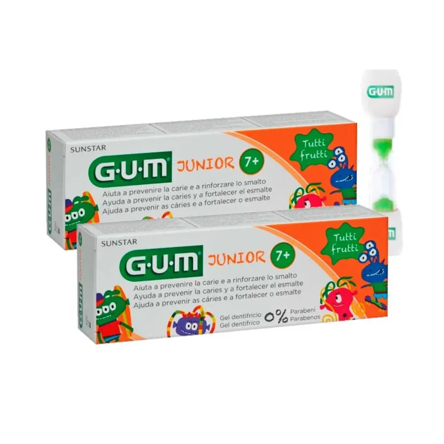 Mantener los dientes sanos y fuertes es más eficaz con el Gum Gel dental duopack para niños a partir de 7 años, que contiene un delicioso sabor tutti-frutti.