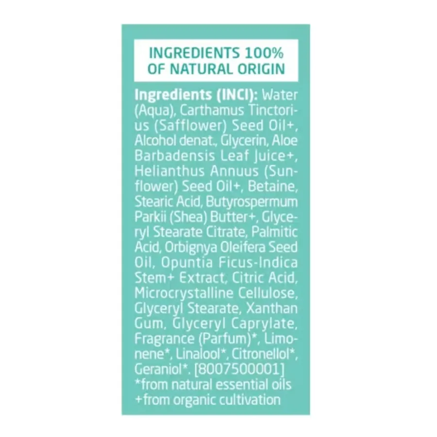- Aloe vera orgánico, que refresca e hidrata en profundidad.