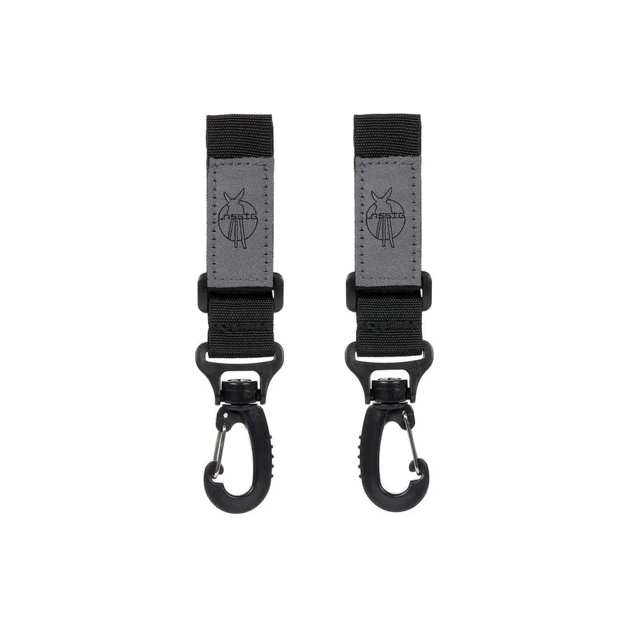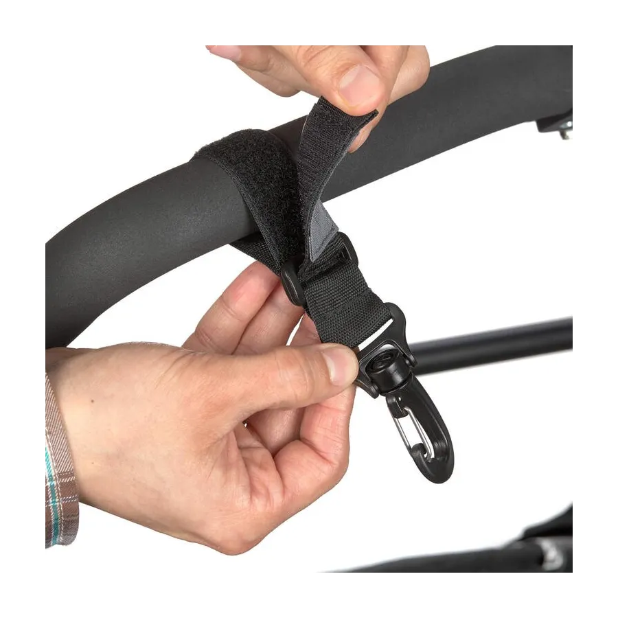 Fabricados en poliéster de alta calidad, con sistema de cierre velcro ajustable, estos ganchos se adaptan fácilmente a casi todos los modelos de cochecito, ofreciendo una sujeción firme y práctica. Su anilla metálica añade un extra de durabilidad para soportar el peso de tus objetos esenciales durante los paseos.