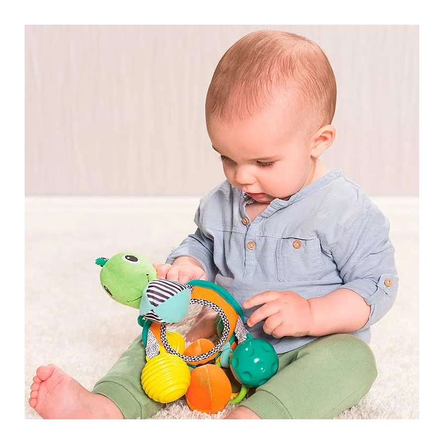 Además de ser fabricada con tejidos súper suaves, viene con un divertido espejo y cuando se agita produce un sonido de traqueteo. ¡la tortuga espejo Infantino se convertirá en su juguete favorito!