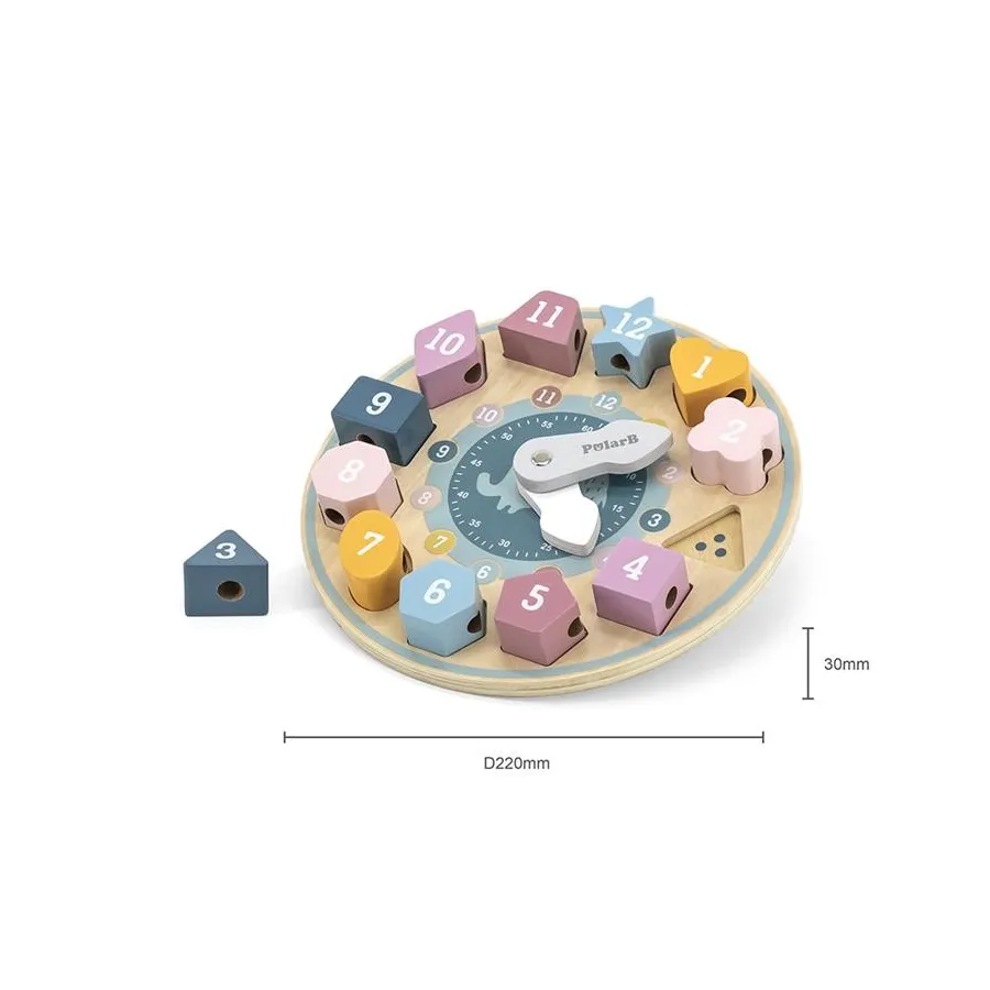El peque se divertirá mucho jugando a encajar cada pieza en su lugar y moviendo las manecillas marcando las horas. Además, todos los bloques se pueden enhebrar en una cuerda ofreciendo muchas posibilidades de juego y aprendizaje lúdico.