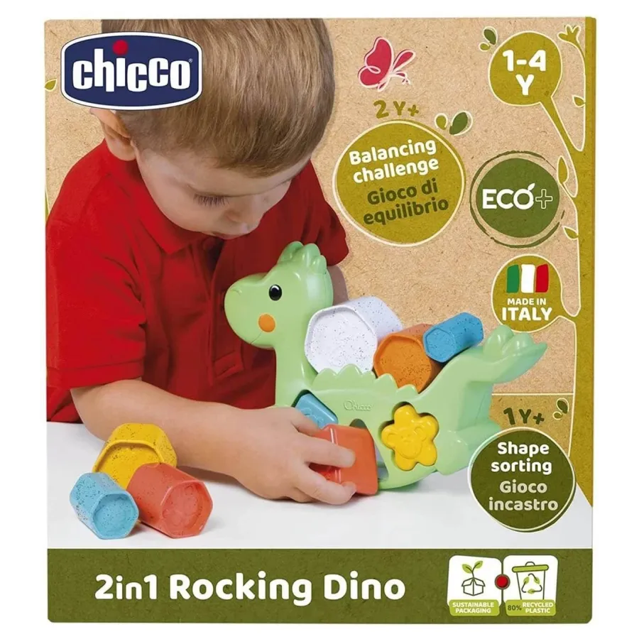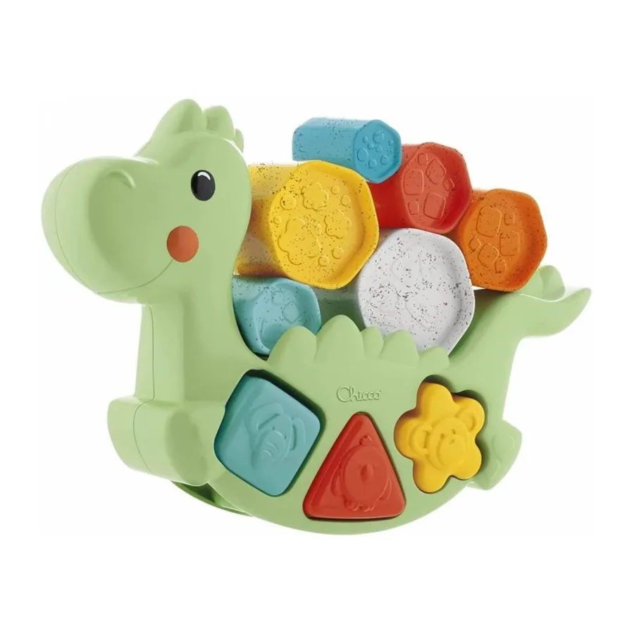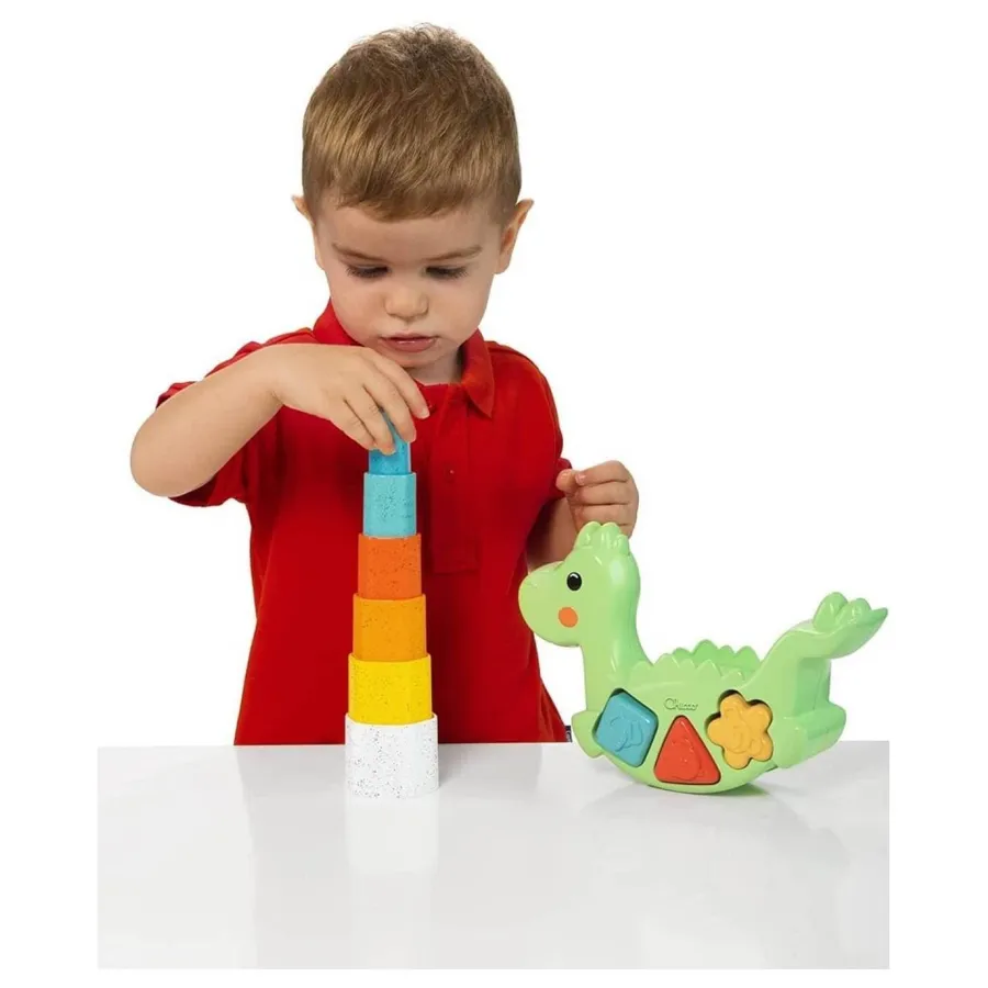 Diseñado para el desarrollo de las habilidades del bebé. La pieza central es un dinosaurio que se balancea y puede portar las piezas adicionales con diferentes formas, encajables y apilables. Elaborado con un 80% de materiales reciclados. Perfecto para aprender a clasificar, encajar, apilar de mayor a menor o viceversa y mantener el equilibrio del Dino con la posición correcta de las piezas en la parte superior.