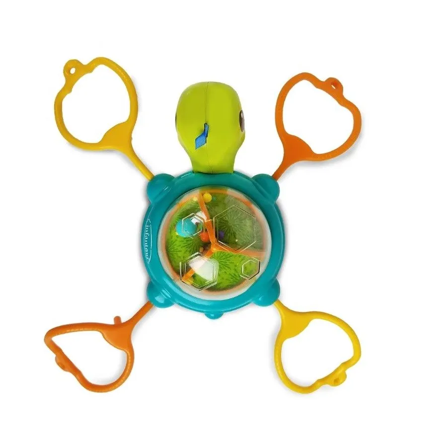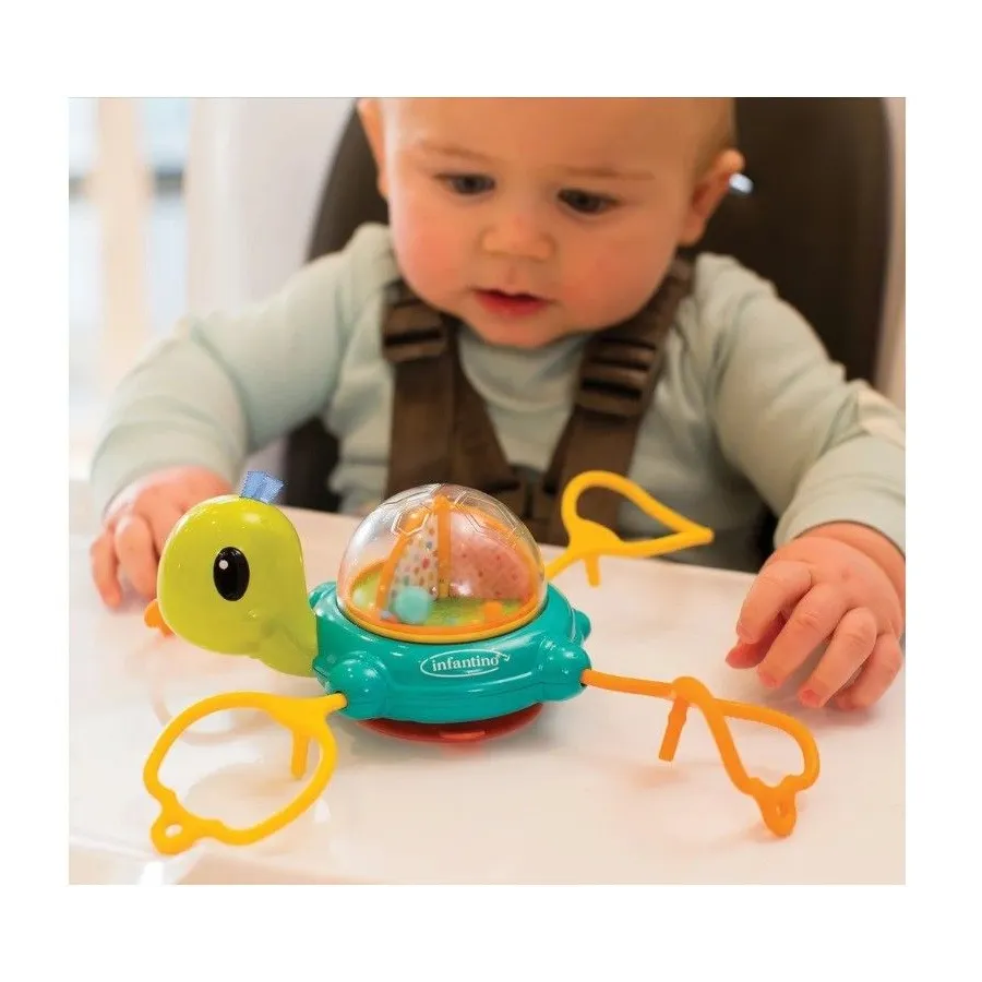 Este precioso Juguete en forma de Tortuga de Infantino, posee unas ventosas que permite colocarlo en cualquier superficie, tales como mesas, tronas, etc. Si tu bebé tira de sus patitas se activa el movimiento de las bolas que tiene en su interior, proporcionando diversión y ayudando a desarrollar todos sus sentidos.