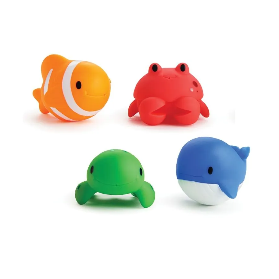 Bote de 4 juguetes de baño para tu bebé, con formas suaves, redondeadas y divertidas para convertir el baño en el momento más especial del día.