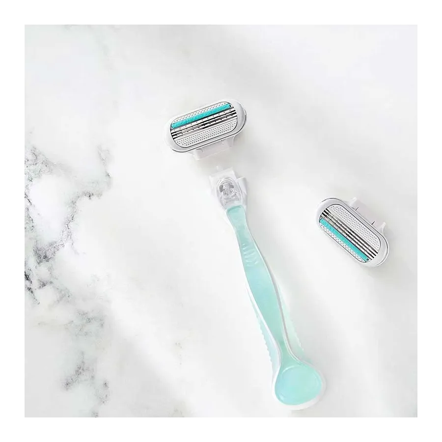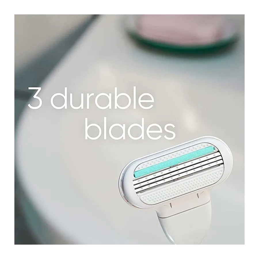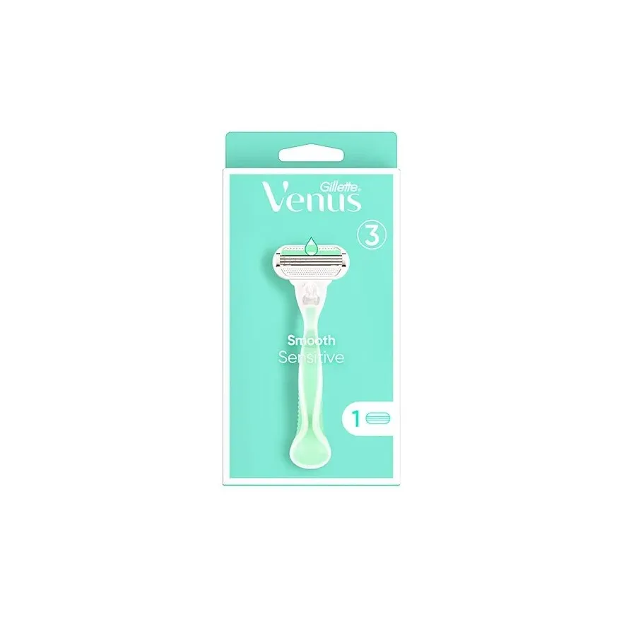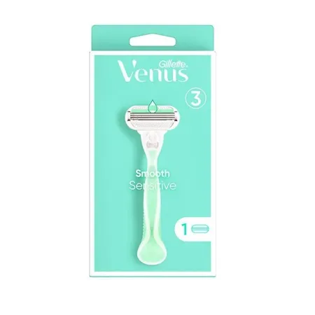 Novedad , la maquinilla Gillette Venus Smooth Sensitive cuenta con 3 hojas para un afeitado más duradero y lleva incorporada una tira lubricante para un mayor deslizamiento con un toque de Aloe Vera