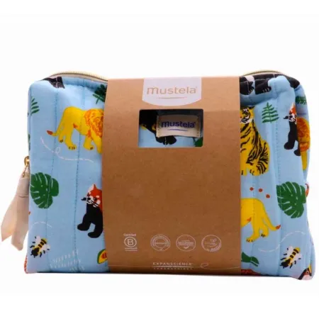 Precioso Neceser jungla con primeros productos de Mustela , con el 96 % de ingredientes naturales , buenos para la piel del bebé y bueno para el planeta